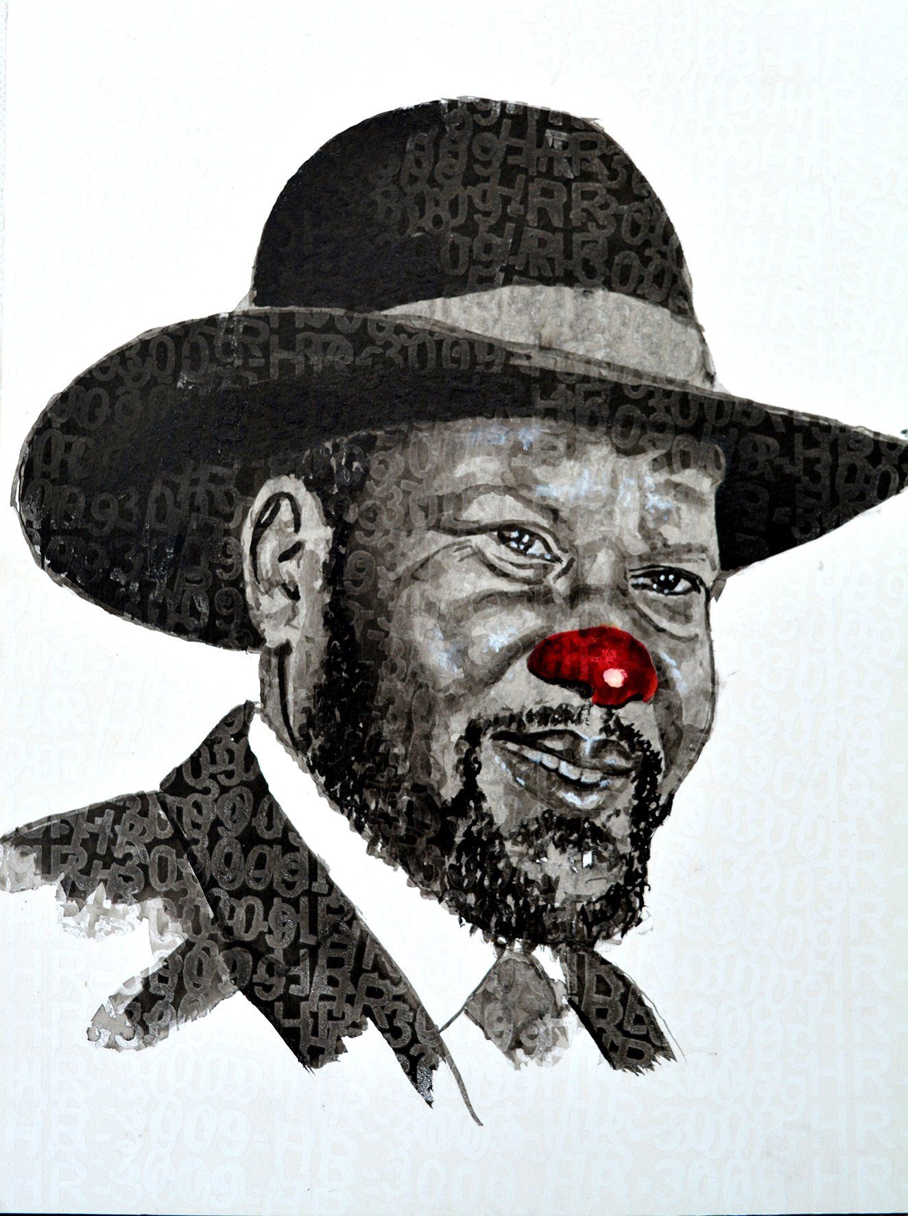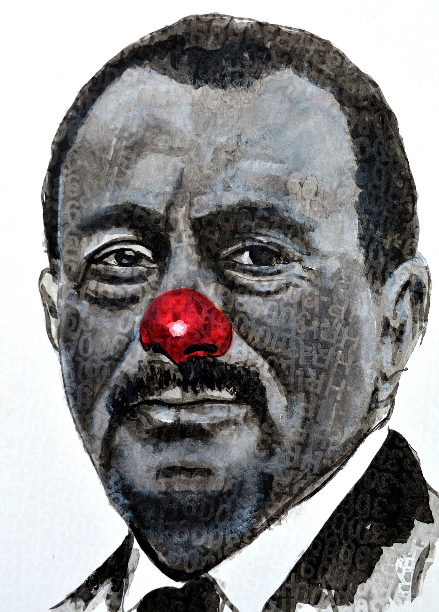 Jean David Nkot's installation Jeux de clowns brings together twenty portraits of political leaders in office or not, which the artist dresses with a red nose that contrasts with the very official poses adopted by the leaders. The political figures are discredited, ridiculed, compared to clowns and crowd entertainers. The portraits are placed next to each other on an assemblage of images taken from international news: shots that tell of the crises, displacements and struggles that the world's populations experience and undertake on a daily basis. The artist materializes in the exhibition space the distance between the decision-makers and their subjects, these humans who nevertheless inhabit and give life to the ruled nations. This earthly surface, this world in motion, is the one on which the elected officials, the administrators with high responsibilities, rest.