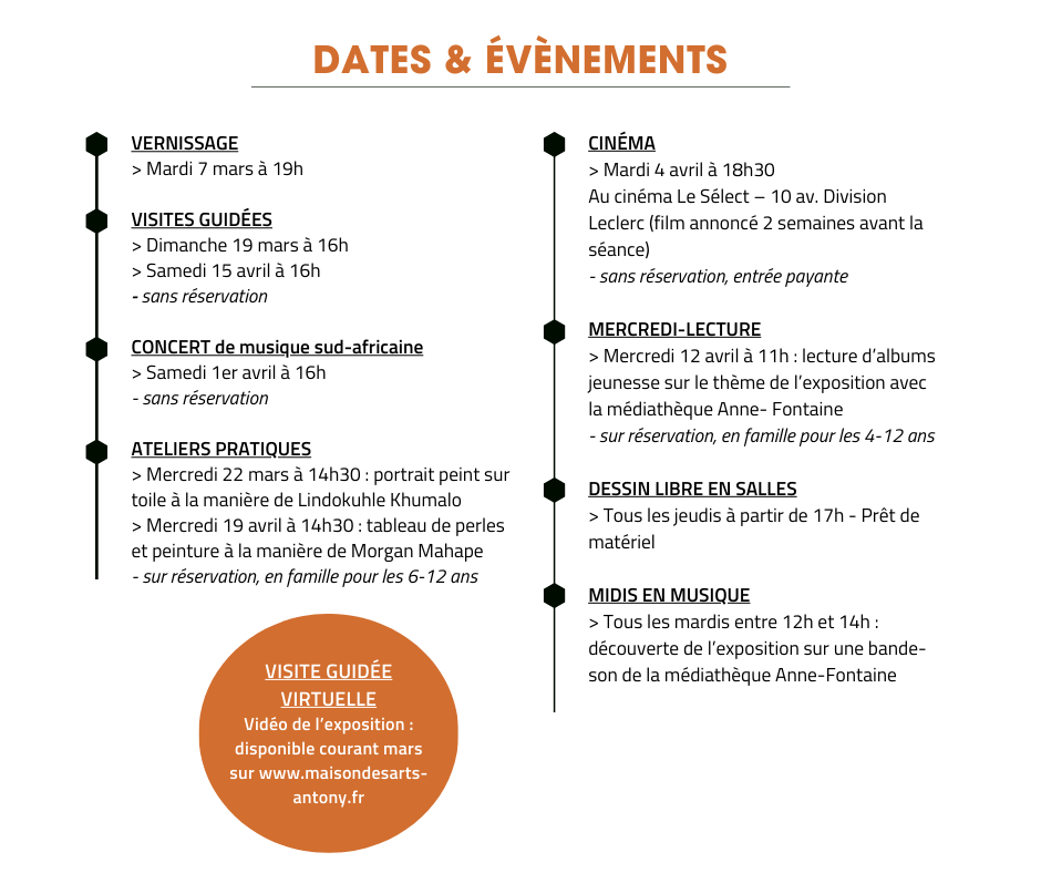 Leila Rose Fanner peint des paysages oniriques inspirés notamment de Gustav Klimt habités par des silhouettes féminines noires. Lindokuhle Khumalo réalise de grands portraits peints dans des couleurs fortes nous parlant tant de nos sociétés actuelles que de l’importance des ancêtres. Morgan Mahape fait dialoguer beaux-arts et culture populaire dans des portraits profonds en perles de verre. Enfin Zanele Muholi, artiste de renommée internationale, présente une sélection d’autoportraits photographiques, peints et sculptés dénonçant toutes les formes de violence.